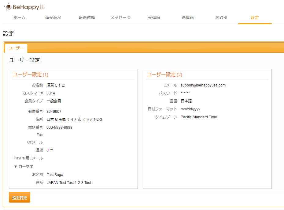 - eTrackingにログイン後、設定のタブをクリックしてユーザー設定画面を開き、左下にある「設定変更」をクリックしてください。