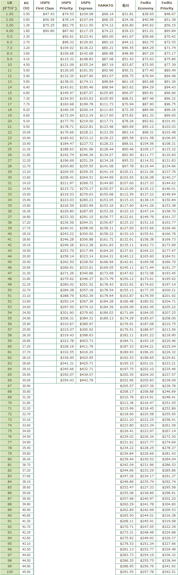 - USPSとYAMATOの送料は実重量が適用され、手数料は容積重量か実重量のどちらか重いほうが適用されます。
