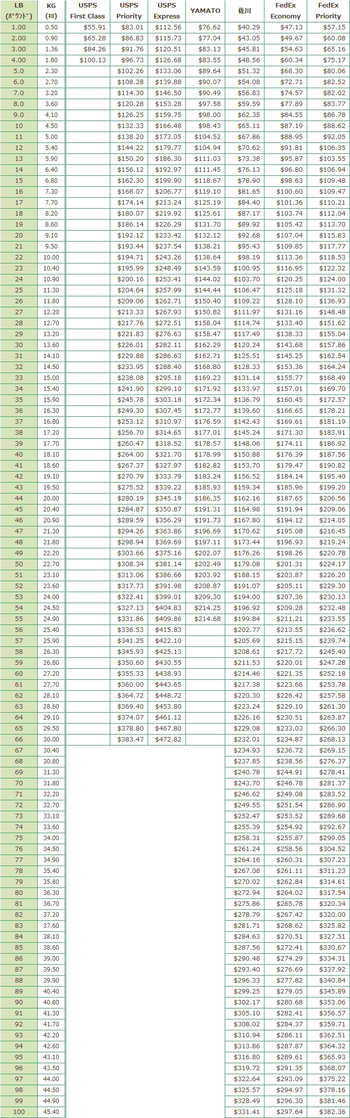 - USPSとYAMATOの送料は実重量が適用され、手数料は容積重量か実重量のどちらか重いほうが適用されます。
